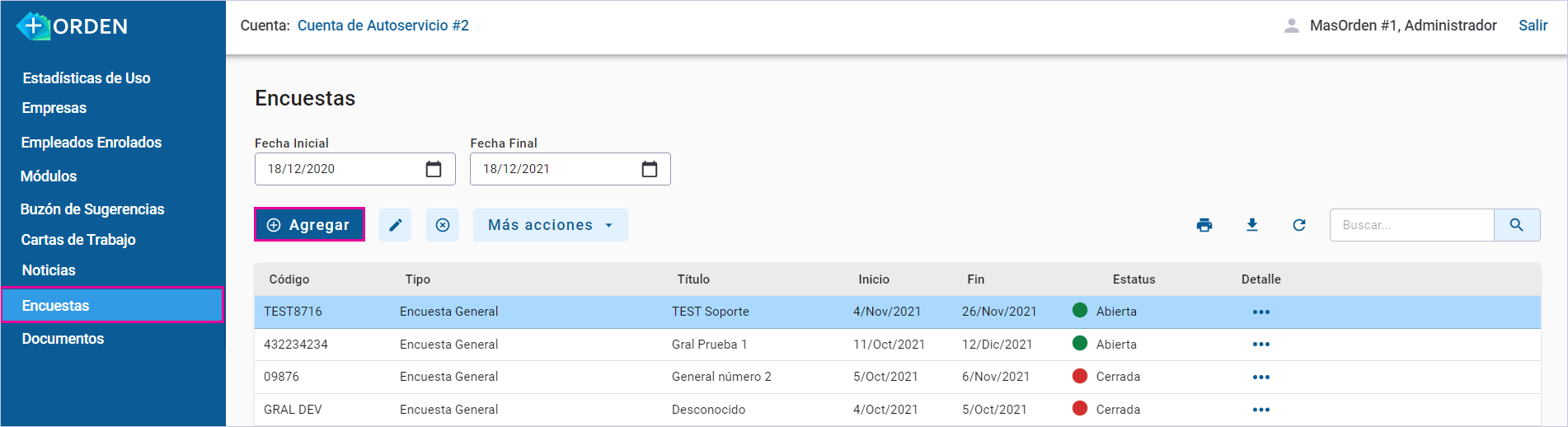 1. En la Consola selecciona la opción de Encuestas en el menú lateral y da clic en el botón Agregar.