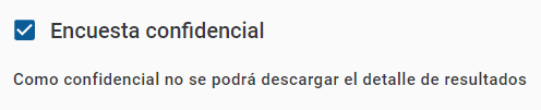 • Al seleccionar este Tipo de Encuesta se habilitará la opción para indicar si será una Encuesta confidencial o pública. Al marcar la casilla, la encuesta será privada y no se podrá descargar el detalle de los resultados por preguntas.