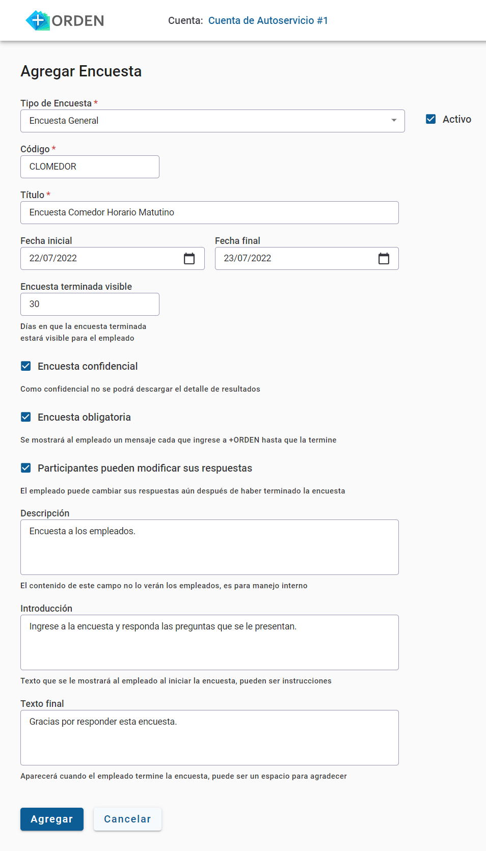 • La casilla de Activo indica que la encuesta se encontrará activa o inactiva.