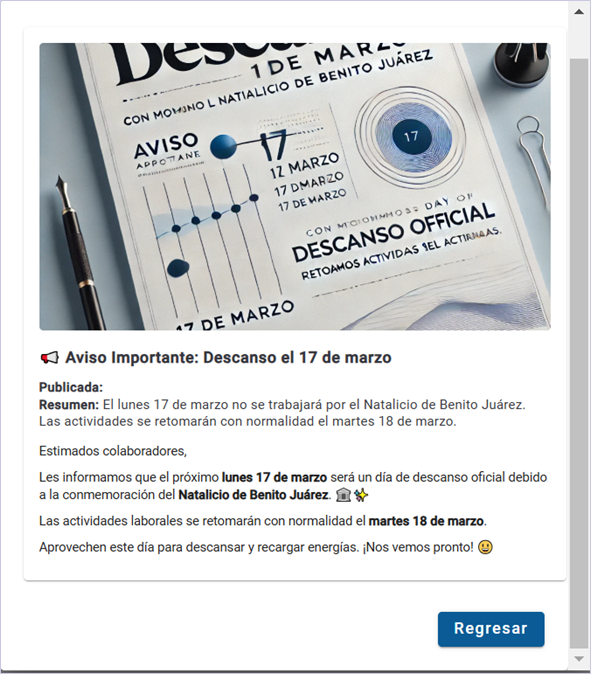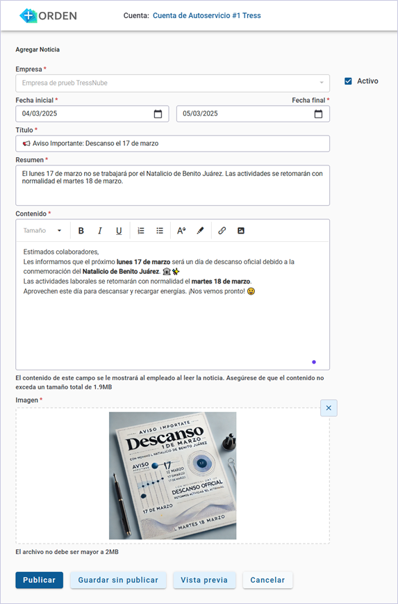 - Vista previa: Antes de proceder con la publicación, puedes ver cómo se verá la noticia una vez publicada. Esta opción te permite revisar el contenido y asegurarte de que está listo para ser compartido con los empleados.