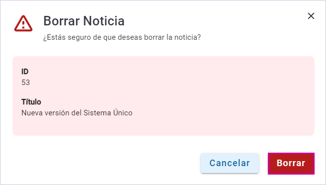 2. Aparecerá la ventana Borrar Noticia mostrando la advertencia ¿Estás seguro de que deseas borrar la noticia? Da clic en Borrar para eliminar la noticia.