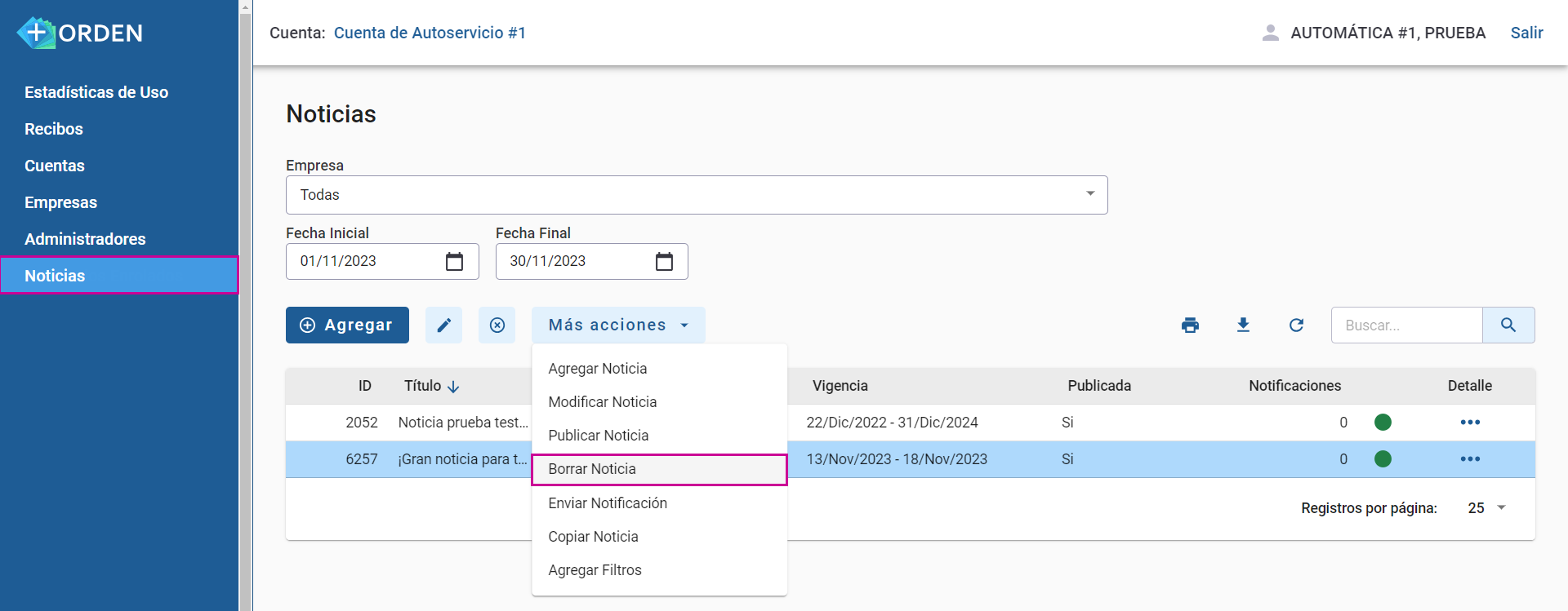 El siguiente documento describe los pasos para borrar una noticia desde la Consola de Administrador +ORDEN (Consola).
