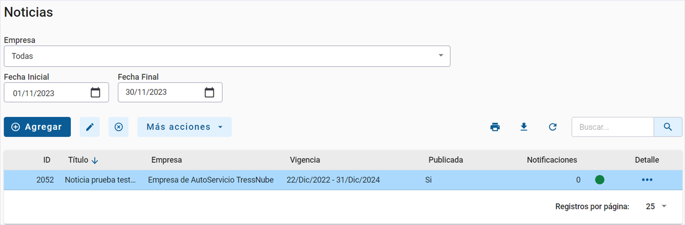 3. La lista de Noticias se actualizará, ya no mostrará la noticia eliminada.
