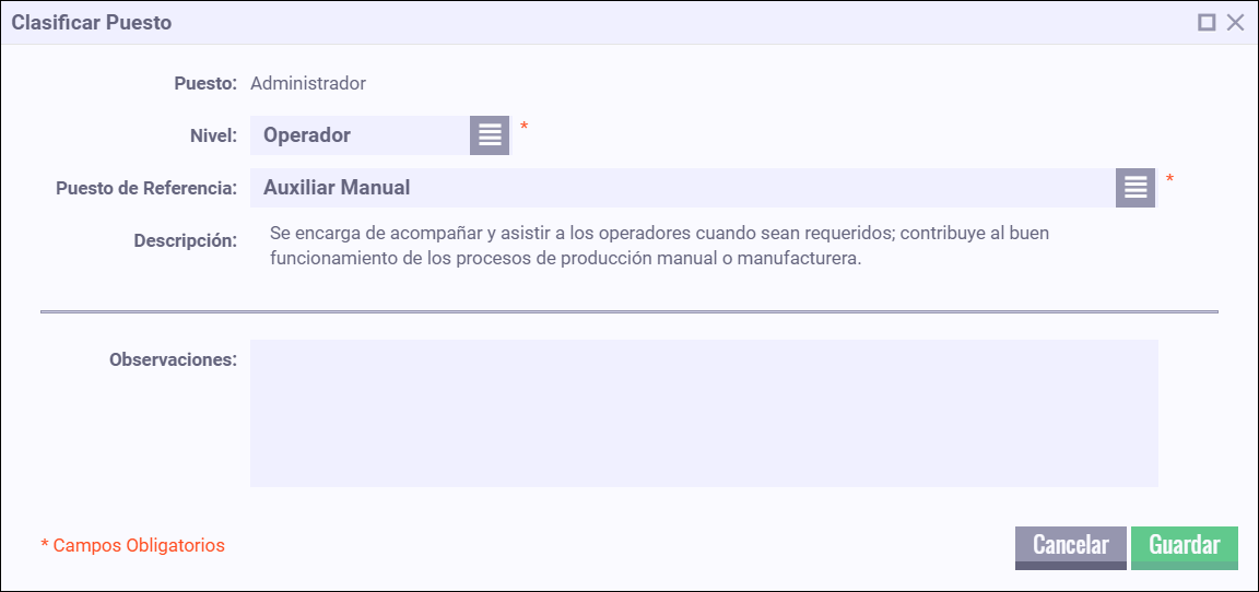 Aparecerá la pantalla Clasificar Puesto, llena los campos según corresponda.