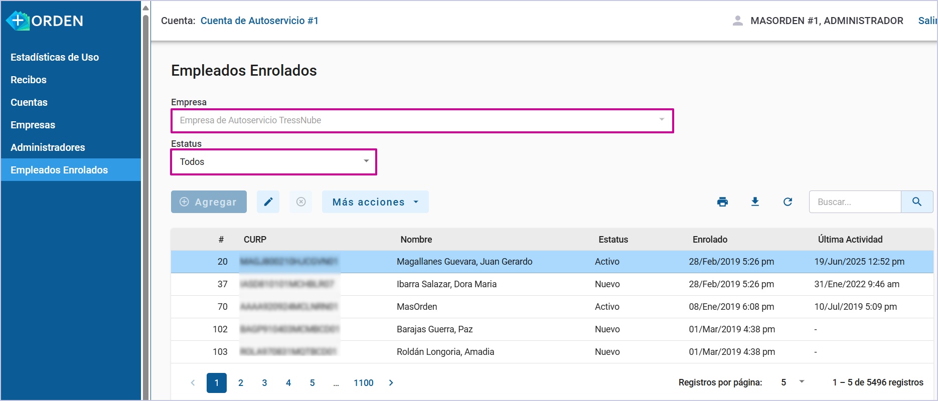 - Nuevo indica que se muestran los empleados con estatus Nuevo y no registrado en +ORDEN.