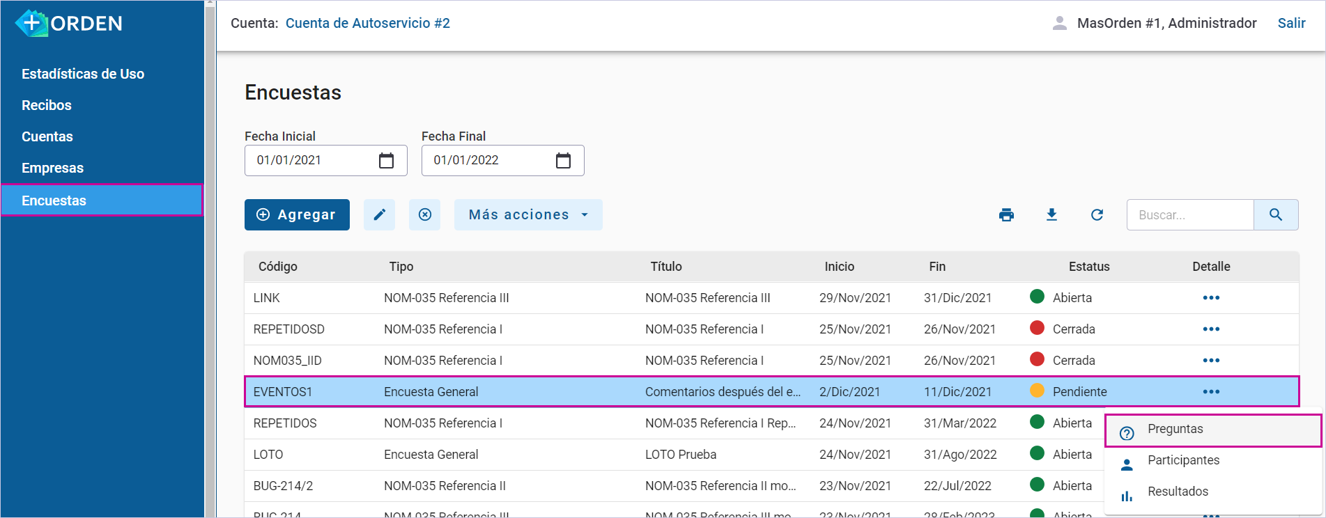 1. En el menú lateral posiciónate en Encuestas y selecciona en el menú de acciones () de la encuesta la opción Preguntas.