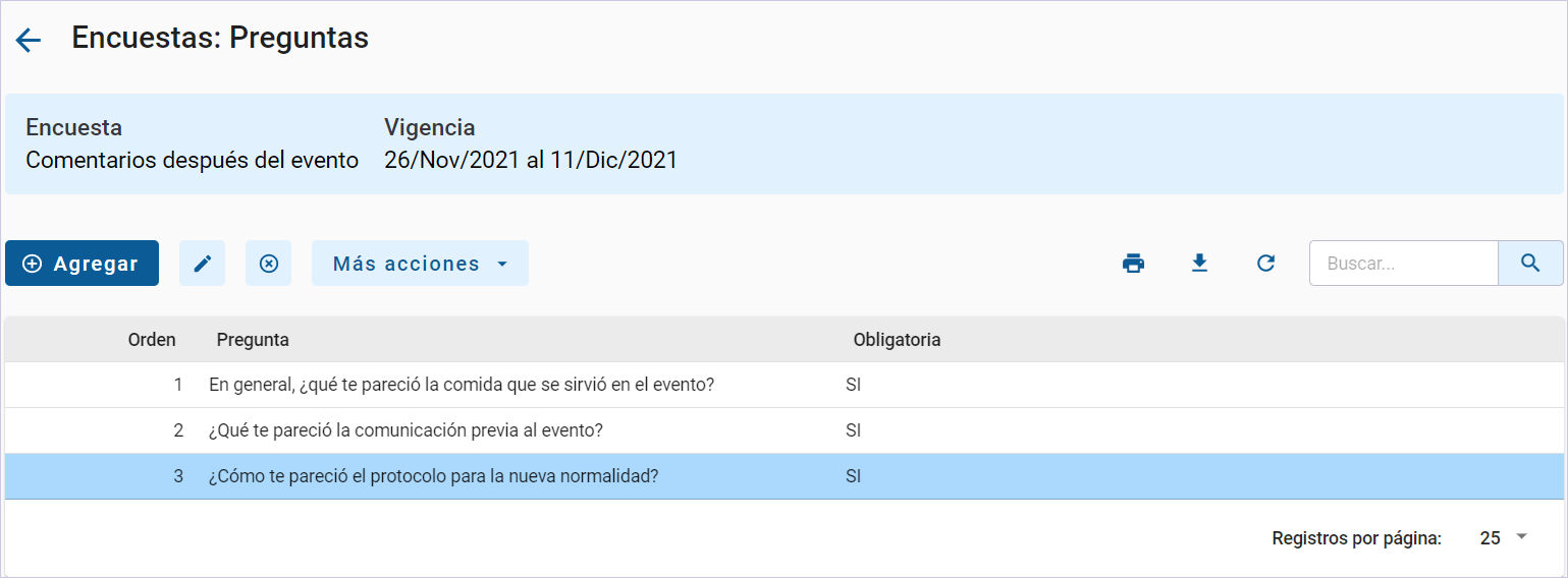 2. Se mostrará la pantalla Encuestas: Preguntas, aquí podrás visualizar y consultar la siguiente información: