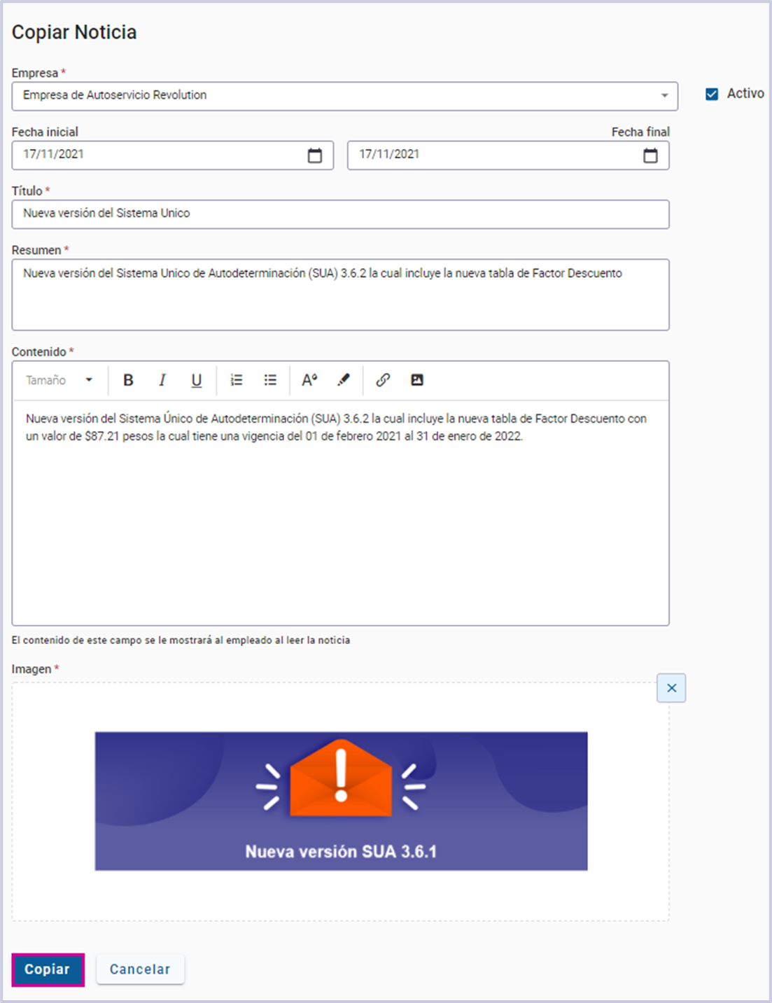 2. Aparecerá la ventana Copiar Noticia, selecciona la Empresa en la que requieras Copiar la noticia, también puedes realizar ajustes en todos los campos si lo requieres. Para terminar, da clic en Copiar.