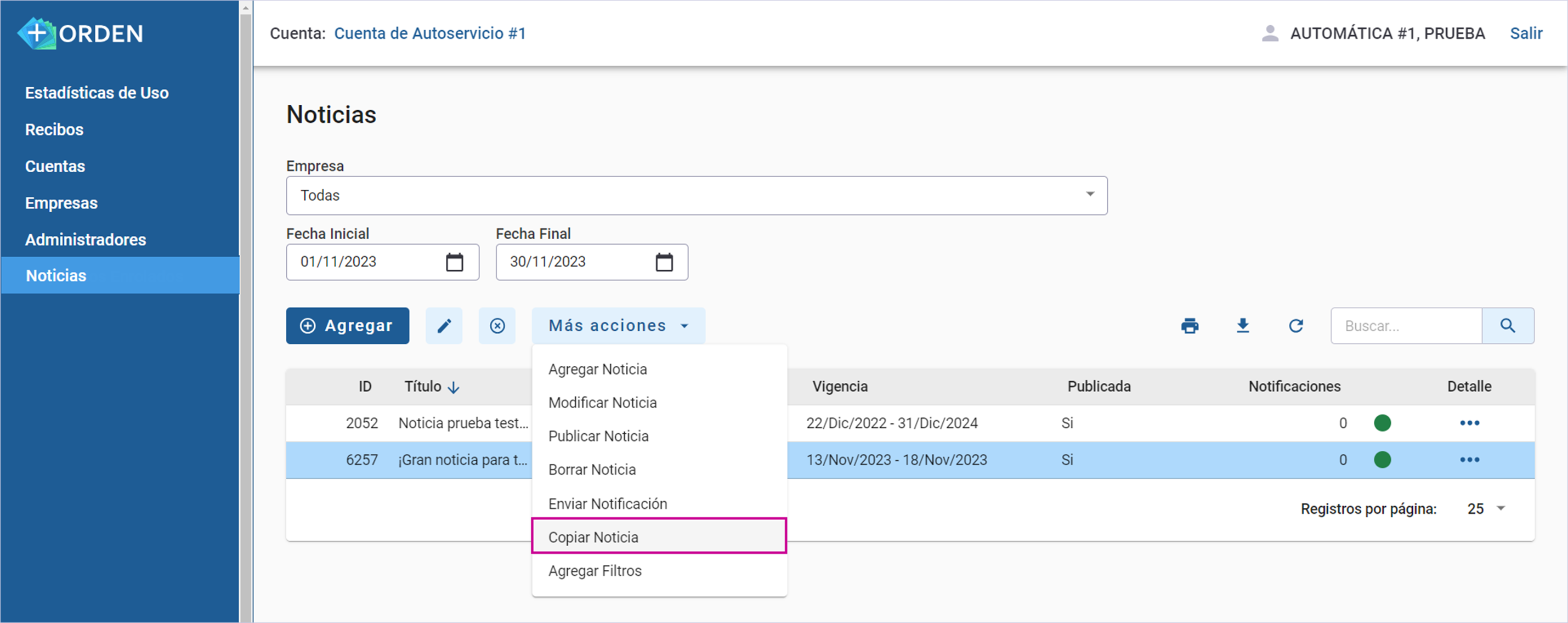 El siguiente artículo describe los pasos para copiar una noticia desde la Consola de Administrador +ORDEN (Consola).