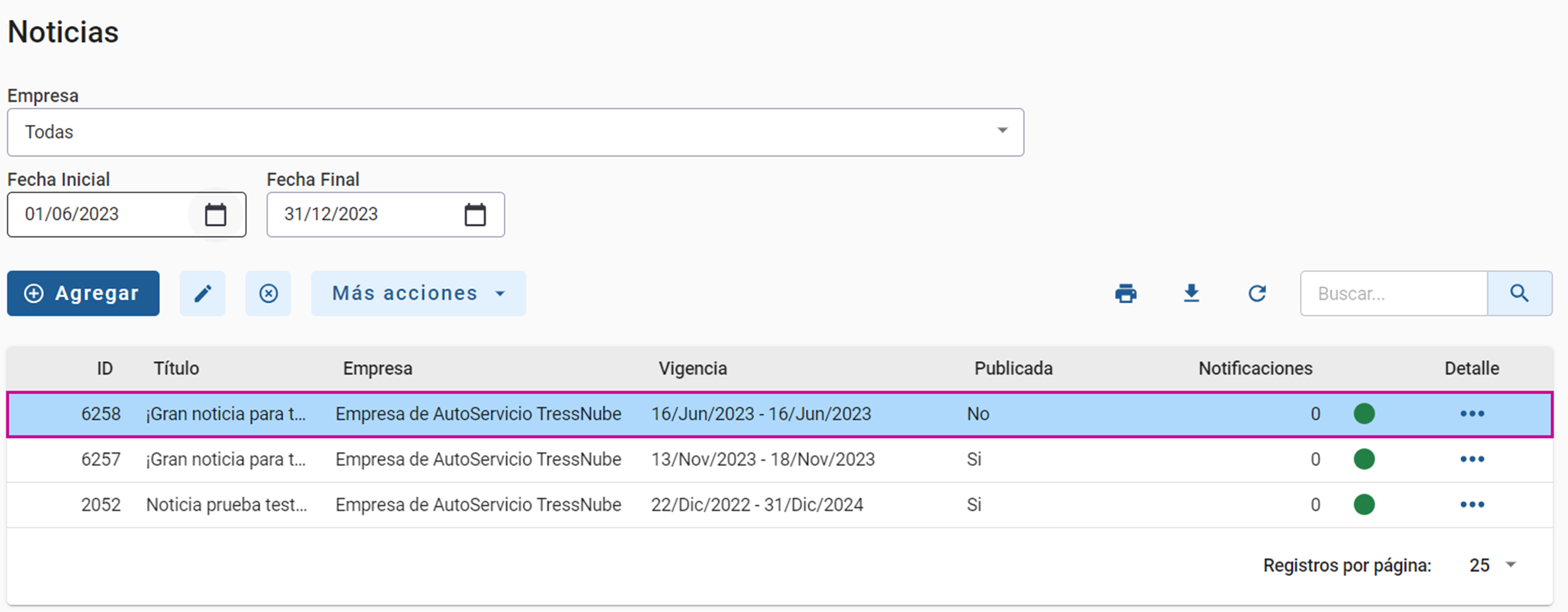 3. La lista de Noticias se actualizará reflejando la noticia en la Empresa seleccionada y con los cambios aplicados.