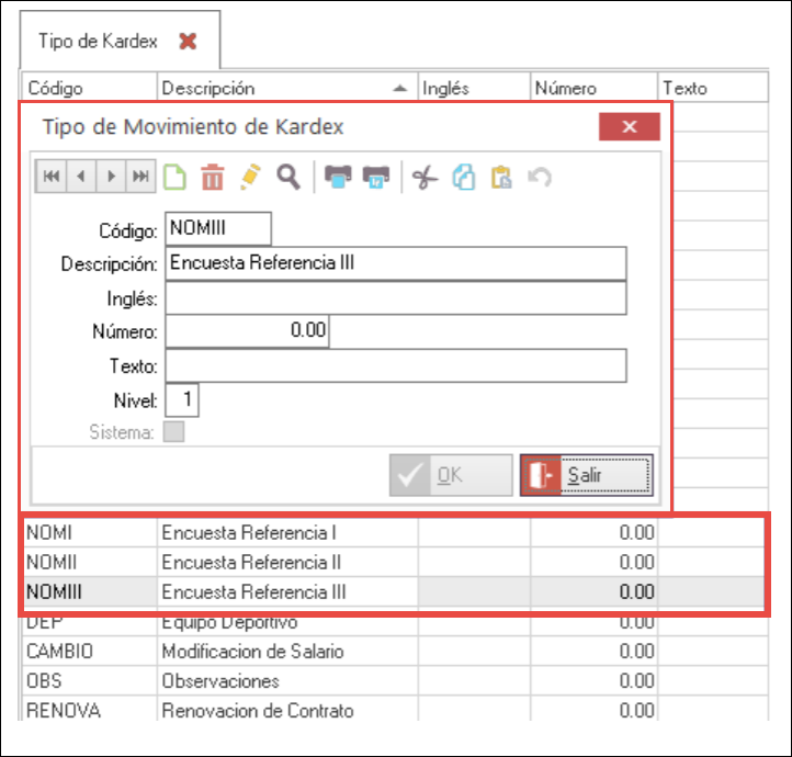 Los resultados exportados de +ORDEN contienen una serie de códigos de tipos de kárdex que deben ser registrados en Sistema TRESS, dentro de Tablas | Historial | Tipo de Kardex, estos son: