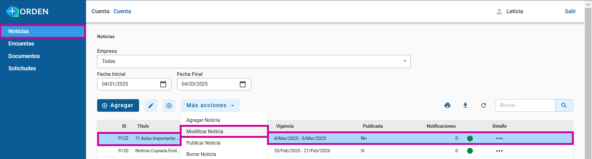 Nota: También puedes dar doble clic sobre el nombre de la noticia o selecciona el ícono de modificar: