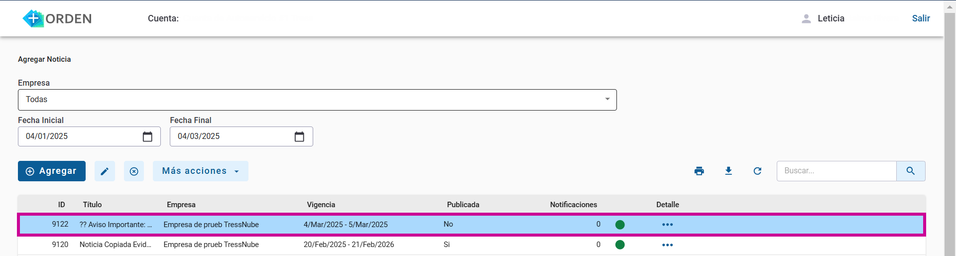 3. La lista de Noticias se actualizará y guardará los cambios realizados.