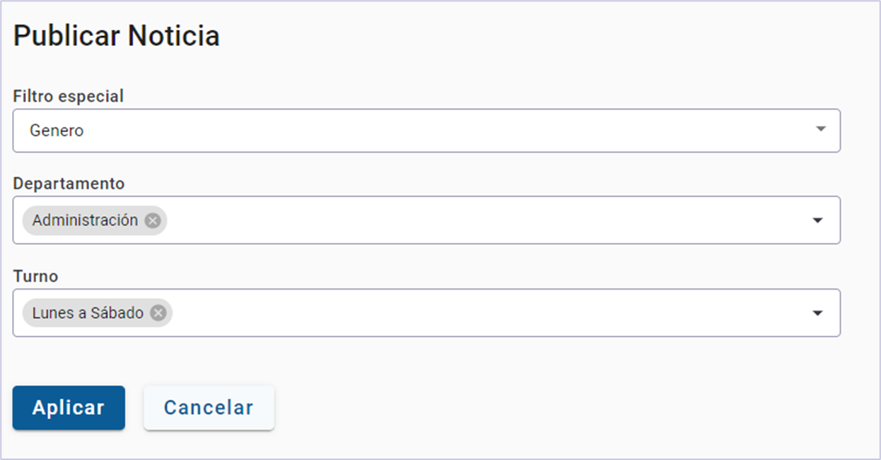 2. En la siguiente pantalla se mostrarán los filtros especiales o pre-configurados en tu empresa para seleccionar a los empleados que se les enviará la Noticia. Selecciona los filtros de interés y da clic en Aplicar para continuar.
