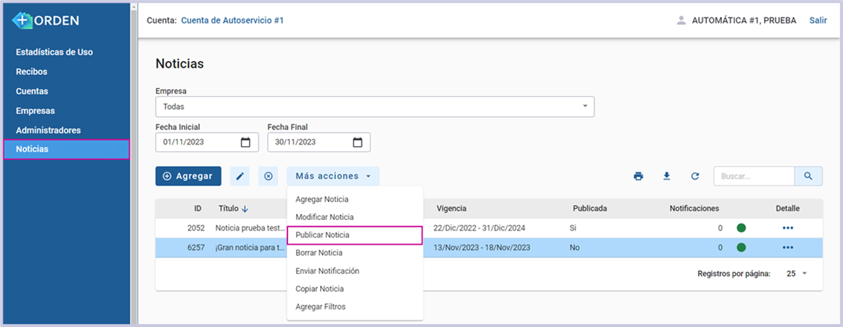 1. Selecciona Noticias del menú lateral, da clic sobre el renglón de la noticia que requieras publicar y en el menú de Más Acciones selecciona Publicar Noticia.
