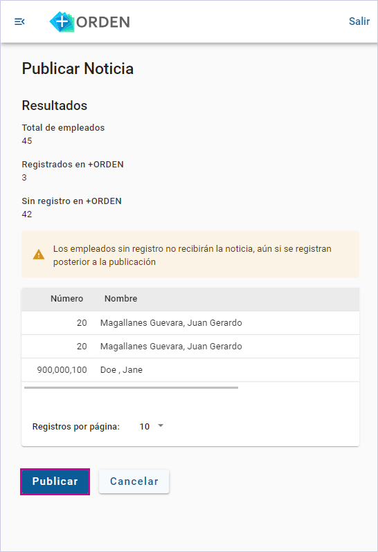 - Se muestra el listado de empleados que estarán recibiendo la noticia, el cual contiene únicamente a los usuarios registrados en +ORDEN y que cumplen con el filtro establecido en el paso anterior. Este listado incluye el Número, Nombre y CURP de los empleados.