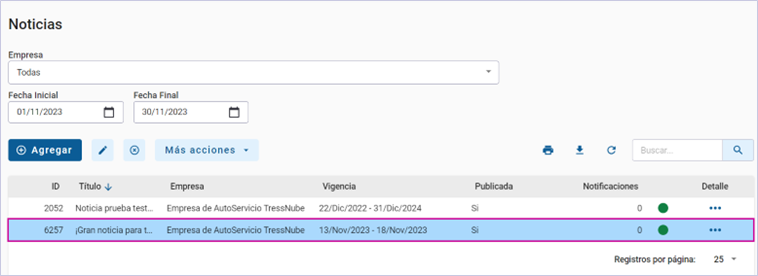 4. La Noticia se publicará, y en la pantalla de Noticias, se actualizará a Si en la columna Publicada.