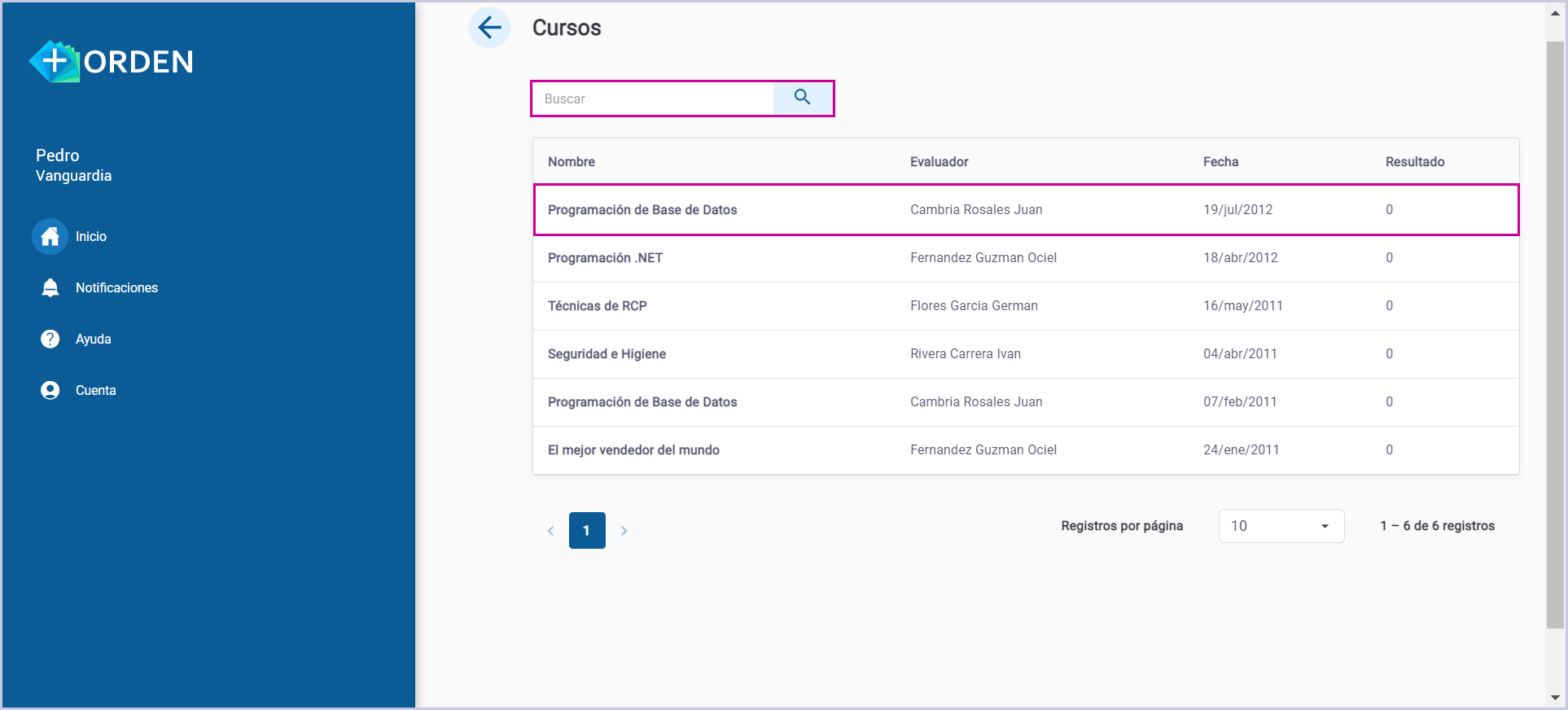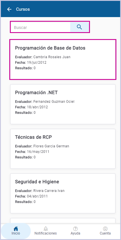 Aparecerá la pantalla de Cursos donde puedes revisar los cursos de capacitación que has tomado en tu empresa. También puedes utilizar el buscador ubicado en la parte superior donde puedes escribir la Fecha, nombre del curso, Evaluador o Resultado que obtuviste de algún curso en específico que requieras encontrar.