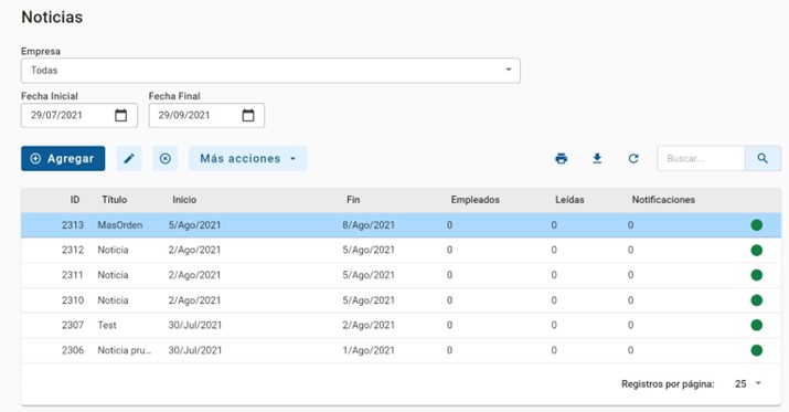 En el apartado de noticias podrás consultar las noticias que hayas creado para +ORDEN, mismos que podrás filtrar por Empresa y Rango de fechas.