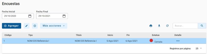 La pestaña de encuestas nos muestra todas las encuestas que se han agregado a +ORDEN, estas se podrán filtrar por rango de fechas.