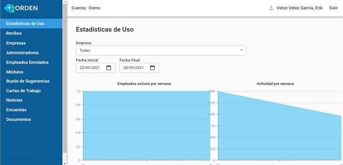 Esta pestaña, como su nombre lo dice, nos muestra las estadísticas de uso de la aplicación de +ORDEN, mismas que podrás filtrar por “Empresa” y “Rango de fechas”