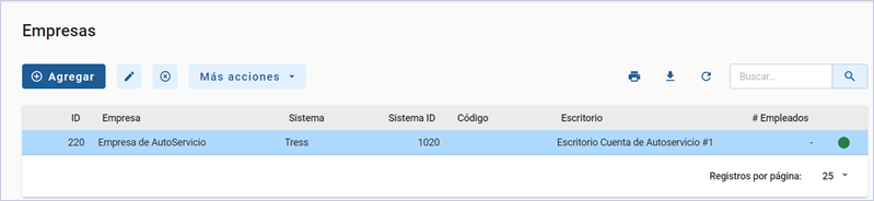 - Activo: Cuando la empresa se encuentra activa nos muestra un punto color verde, caso contrario cuando la empresa ya fue desactivada de +ORDEN el punto será de color rojo.