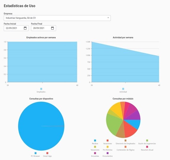 En el campo “Empresa” podrás seleccionar la empresa que quieras consultar, en caso de tener más de 1 podrás seleccionar las estadísticas de todas las empresas juntas.