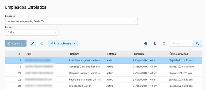 Adicional a lo anterior podrás exportar un reporte en Excel con toda la información mostrada dando clic en Más acciones y seleccionando la opción Exportar Empleados Enrolados.