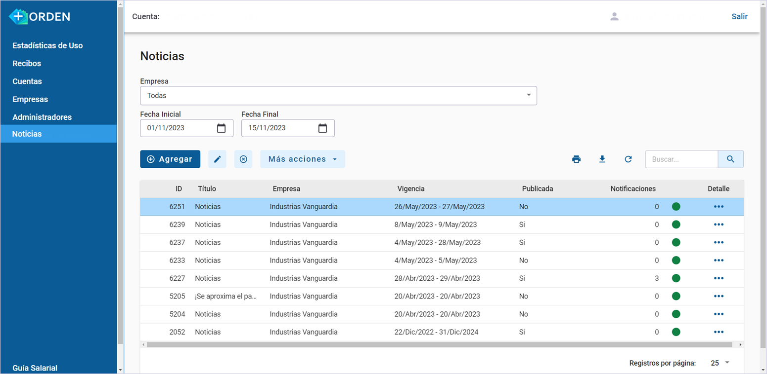 En la Consola de Administrador +ORDEN (Consola) en el menú lateral, al seleccionar la opción Noticias permite agregar, modificar, borrar o notificar de la disponibilidad de una noticia para ser mostrada a los empleados de una empresa.